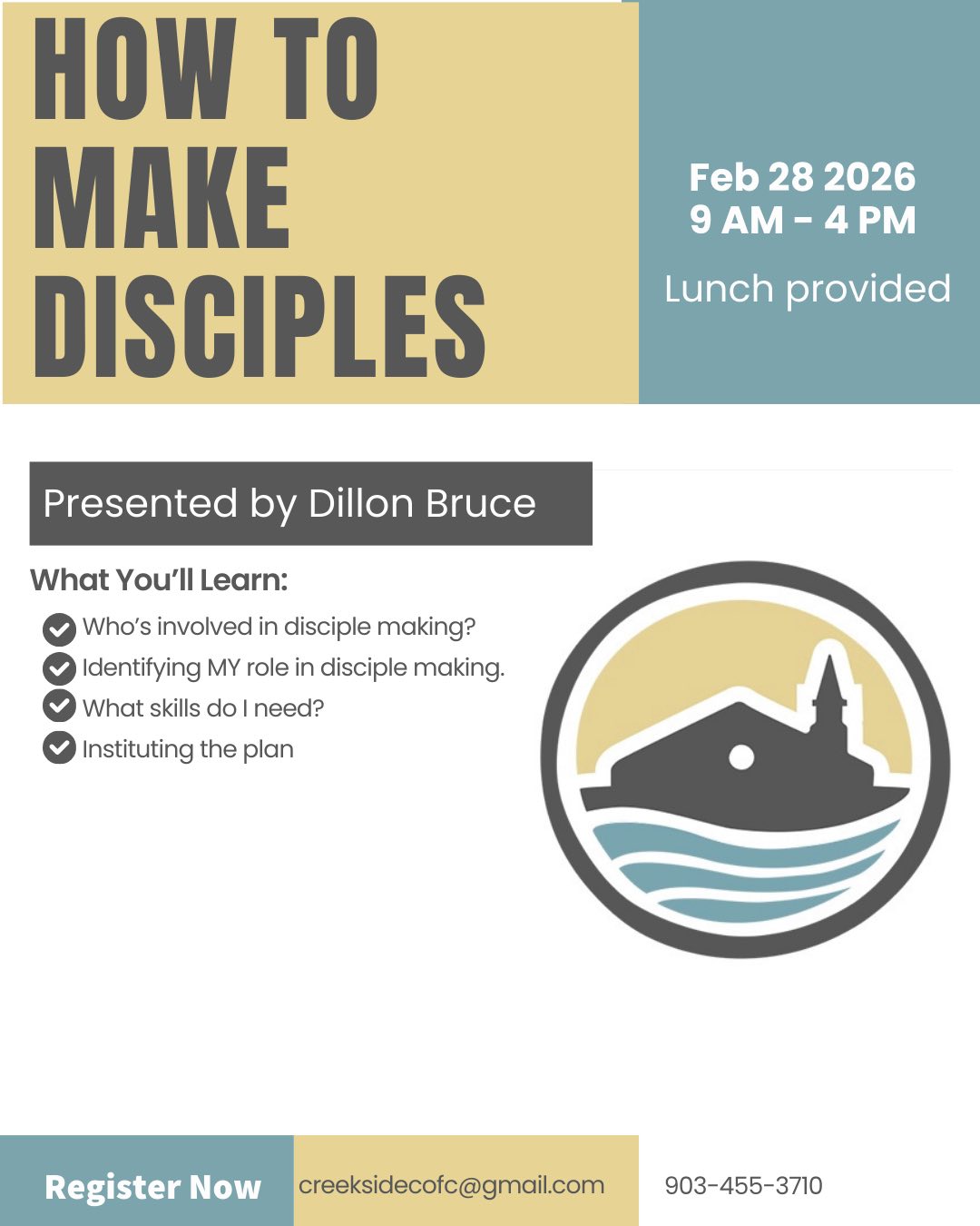 The Elders request your attendance at our "How to Make Disciples" Seminar on February 28th from 9am-4pm. Please register by calling or emailing the office or signing up at the welcome desk. Talk to Jim Hodo for more information.